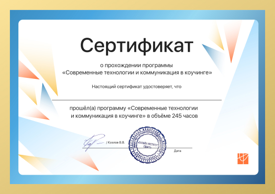 Она устанавливает международные стандарты коучинга, разрабатывает этический кодекс и проводит сертификацию коучей. Мы готовим коучей с сертификацией Level 2 ICF и выдаем документы, подтверждающие вашу квалификацию
